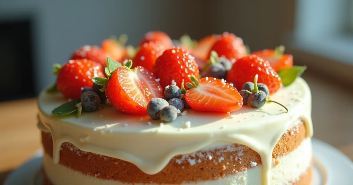 Bolo decorado com frutas vermelhas frescas, como morangos fatiados e mirtilos, sobre cobertura de baunilha em tom creme.
