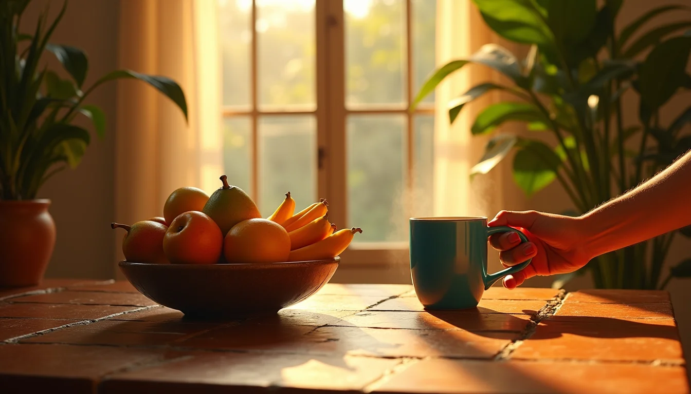 A luz natural que entra pela janela da copa se derrama sobre a bancada da cozinha. O movimento do dia começa aqui, entre o aroma do café e o brilho das frutas na fruteira.