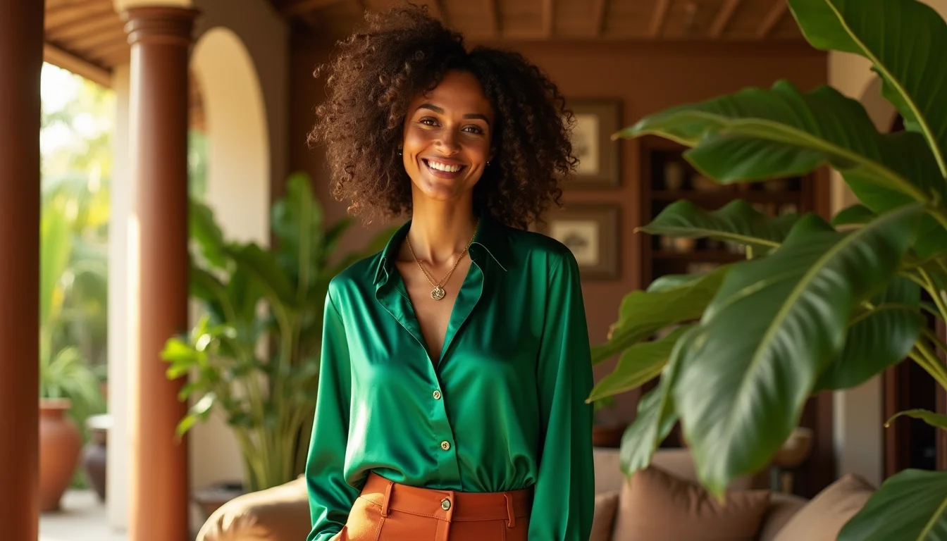 • Texturas mudam tudo: Algodão verde com linho bege é casual e fresco; seda verde esmeralda com veludo marrom é puro drama noturno. Brinque com superfícies para dar profundidade sem gastar uma fortuna.