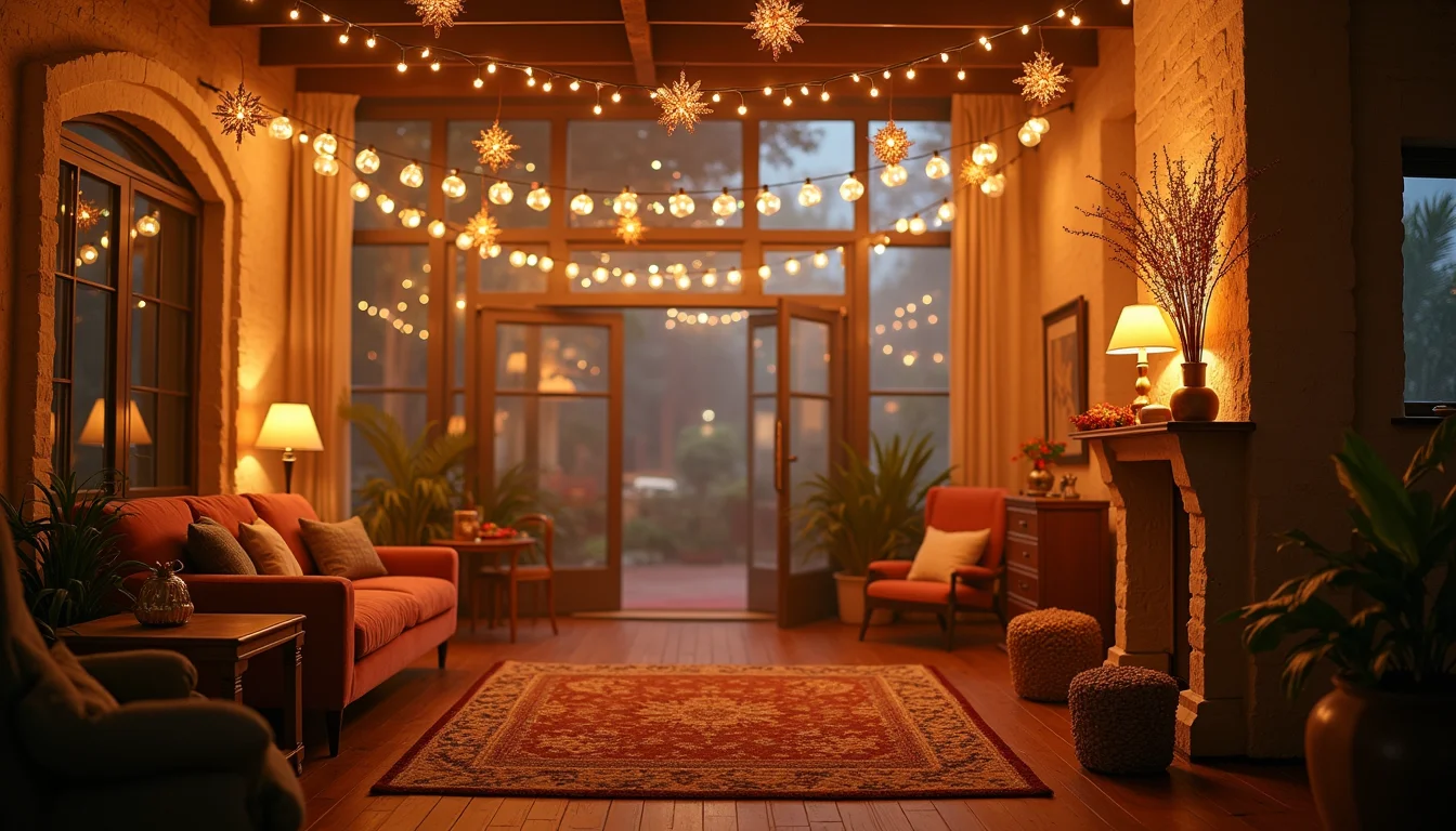 | Iluminação | Fios de fada (LED), velas em recipientes de vidro | Garrafas de vidro com luzes internas, velas em potes decorados |