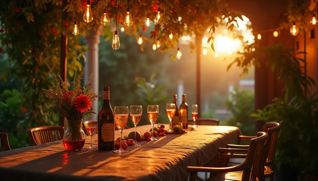 A iluminação suave, com luzes de fada ou velas, cria um ambiente mágico e acolhedor, essencial para o clima de celebração.