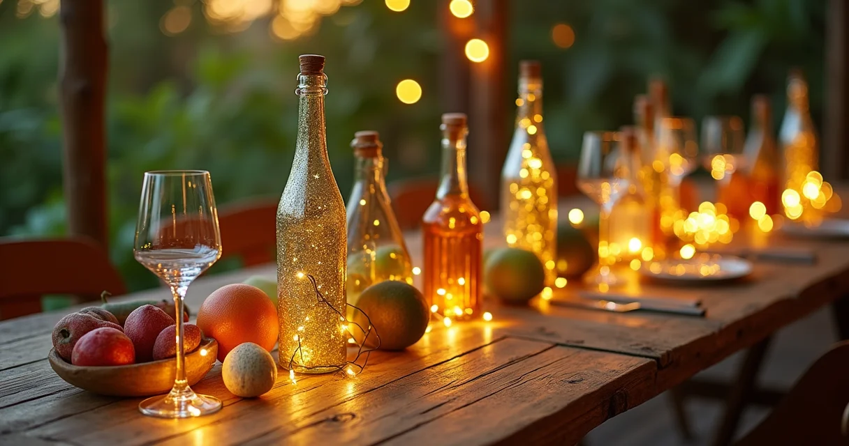 Seu primeiro passo hoje: Abra o armário da cozinha. Separe garrafas de vidro vazias, taças transparentes e uma toalha de mesa neutra. Esses serão os pilares da sua decoração.