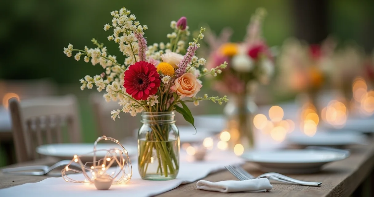 Na recepção, a criatividade é sua melhor amiga. Para as mesas, toalhas de tecido cru ou até mesmo xadrez, dependendo do estilo, trazem um ar acolhedor. Os centros de mesa podem ser simples potes de vidro com velas flutuantes, pequenos arranjos de flores colhidas no dia ou até mesmo suculentas, que depois podem ser dadas como lembrancinhas. Uma ideia econômica e que eu já testei com sucesso é usar garrafas de vidro vazias, de diferentes tamanhos, como vasos para um único botão de flor ou um pequeno galho verde. Fica um charme e quase não tem custo. As cadeiras podem ser simples bancos de madeira ou cadeiras alugadas, decoradas com fitas ou pequenos ramos de folhagem.