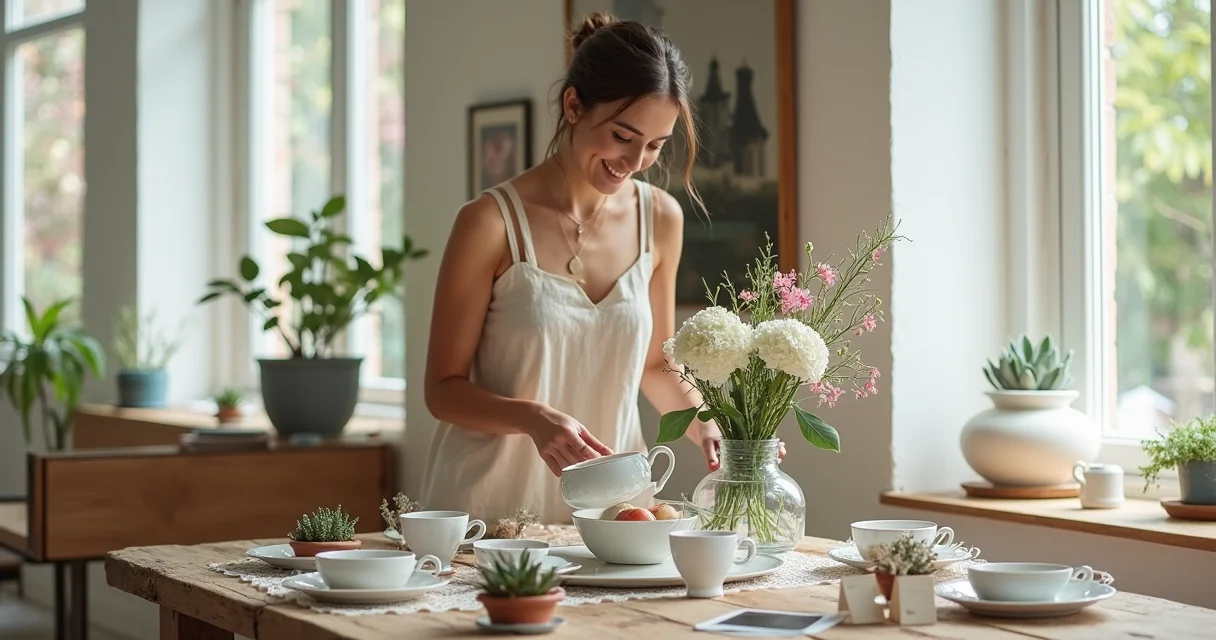 Aqui está o detalhe: use uma base neutra, como um jogo de louças brancas, e adicione camadas com elementos pessoais. Pense em uma pequena planta em um pote reaproveitado ou um livro de receitas aberto.