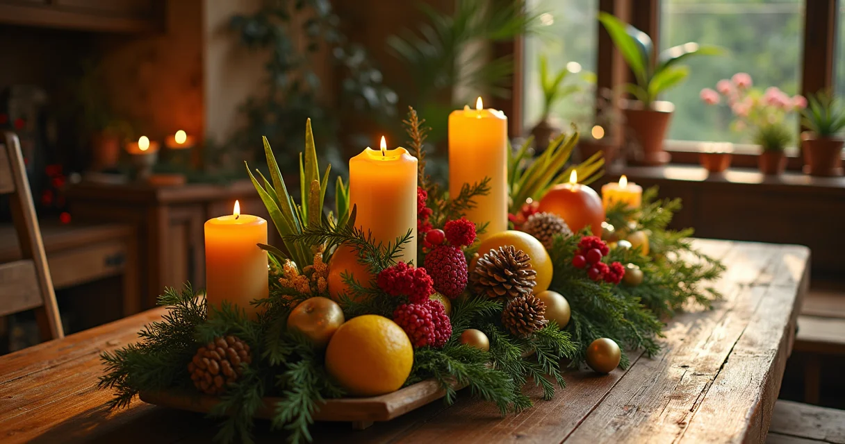 Clássico Reinventado: Use um tronco de madeira rústico como base. Espalhe pinhas naturais, galhos de pinheiro e algumas maçãs ou romãs para um toque de cor. Finalize com velas grossas em tons de creme ou vermelho. O aroma sutil das frutas e do pinho invade o ambiente de forma deliciosa.