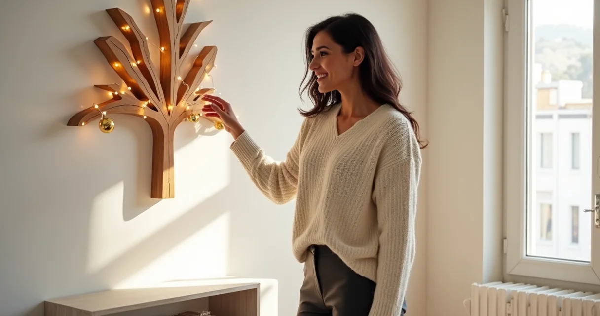 A ‘Árvore de Natal de Parede’, ou Flat Tree, é a rainha da economia de espaço e da praticidade. Você pode criar a sua de diversas formas: com galhos secos presos à parede formando o contorno, com fita adesiva colorida, ou até mesmo com uma cortina de LED em formato triangular.