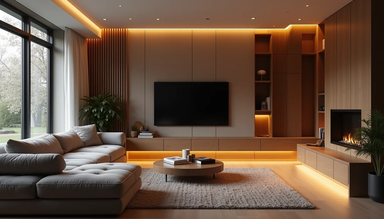 Decoração de sala de TV pequena e moderna apresentando um sofá modular em L na cor off-white, tapete geométrico em tons neutros, e um painel de TV suspenso com iluminação indireta embutida.