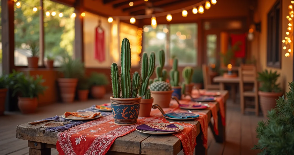Elementos Naturais: Cactos (reais ou artificiais), suculentas, pedras e areia podem ser usados para compor arranjos de mesa ou decorar cantos do ambiente. Eles trazem a sensação de estar no deserto, um cenário clássico do Velho Oeste. Cuidado com cactos reais se houver crianças brincando!
