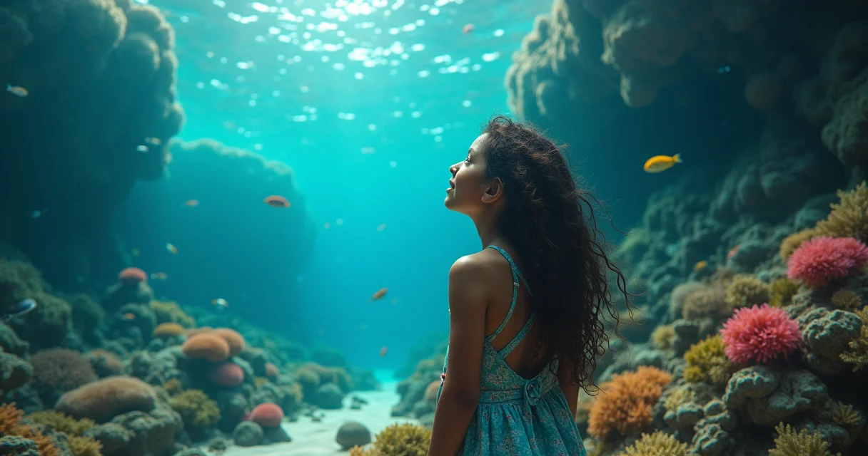 A combinação de tons de azul e verde com detalhes em lilás e rosa cria uma atmosfera etérea, remetendo à profundidade e delicadeza do oceano.