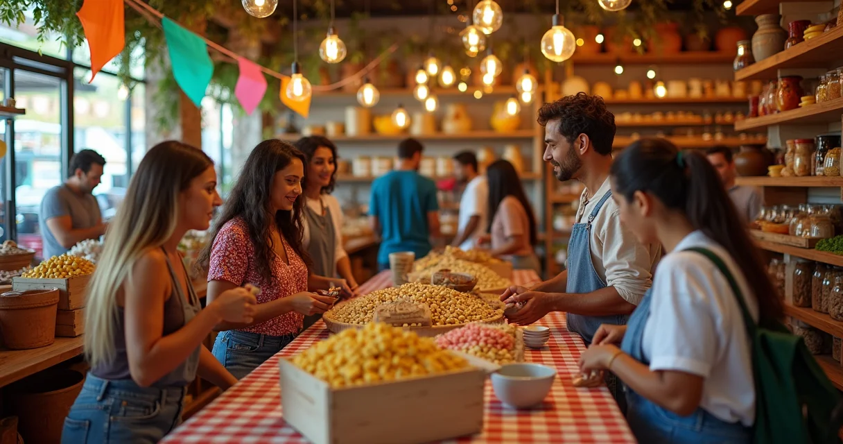 Alimentos/Mercado: Destaque milho, derivados, doces típicos. Crie um ‘cantinho gourmet’ junino com degustação.