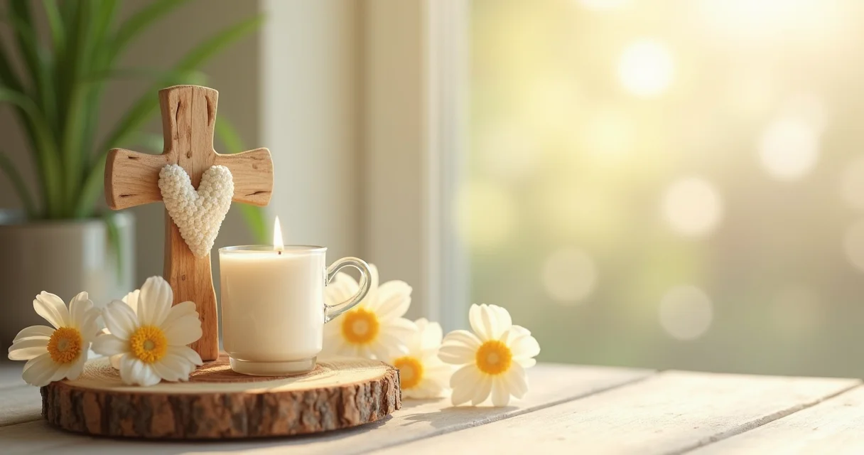 Para adicionar um toque religioso de forma discreta, pequenos detalhes como mini terços dispostos ao lado dos pratos ou um cálice decorativo podem ser usados. O objetivo é que a mesa principal conte uma história visual de fé e celebração, de maneira elegante e descomplicada.