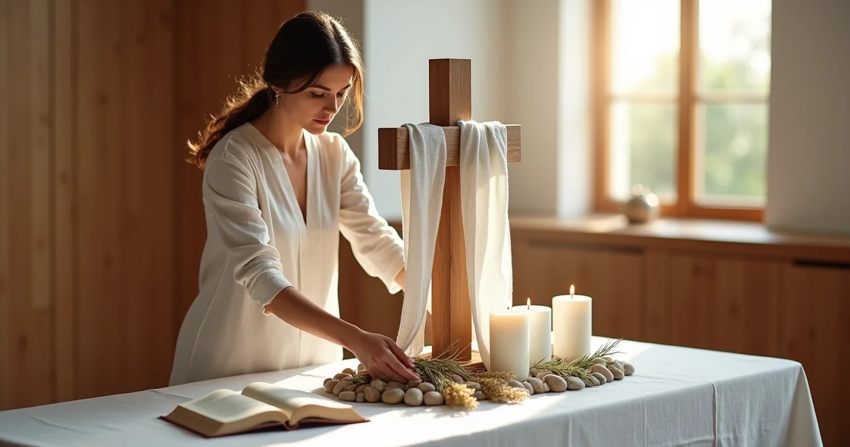 Para uma decoração cristã que realmente toque, precisamos de elementos que falem por si. Além da cruz e do sepulcro, pense em como as cores e texturas podem complementar a narrativa. A simplicidade, muitas vezes, é a chave para a profundidade.