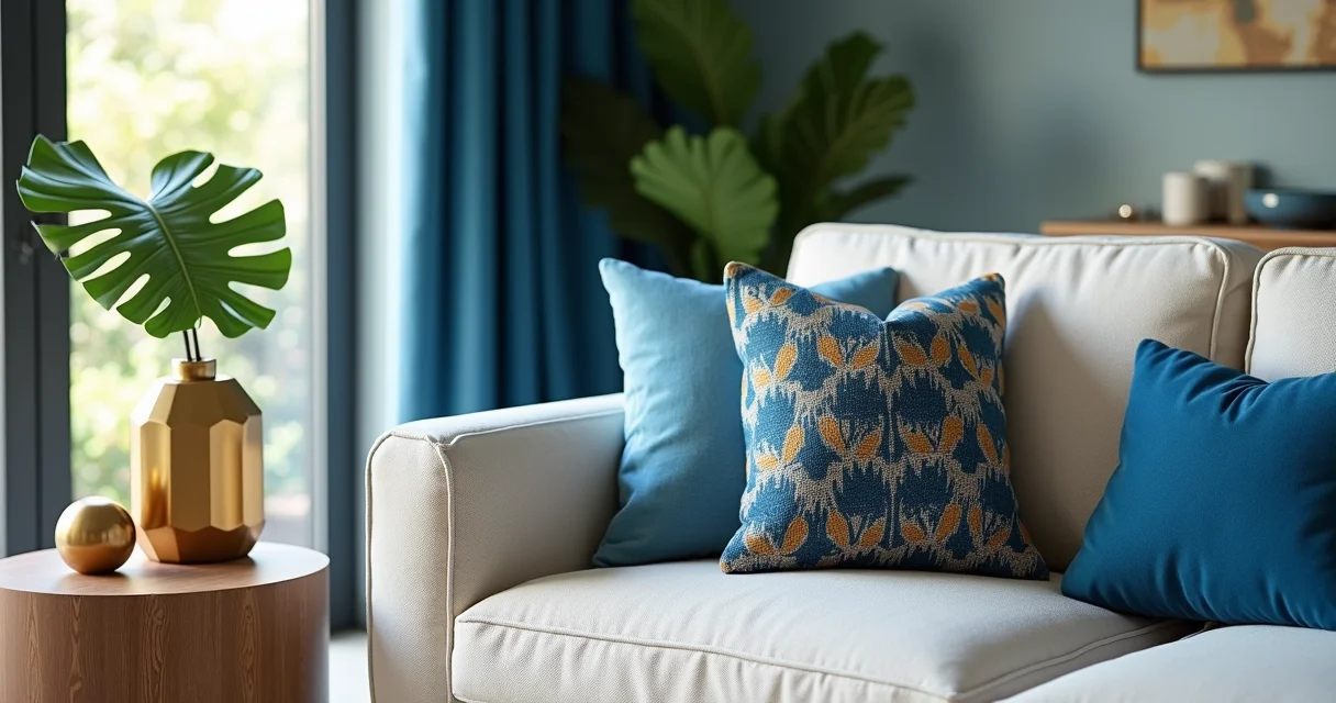 O Sofá como Protagonista: Um sofá em tom de azul, seja ele marinho, petróleo ou um azul mais claro e acinzentado, já é uma declaração. Combine com almofadas em dourado, talvez com texturas diferentes como jacquard ou com um leve brilho metálico. Isso adiciona profundidade e um toque de glamour sem pesar.