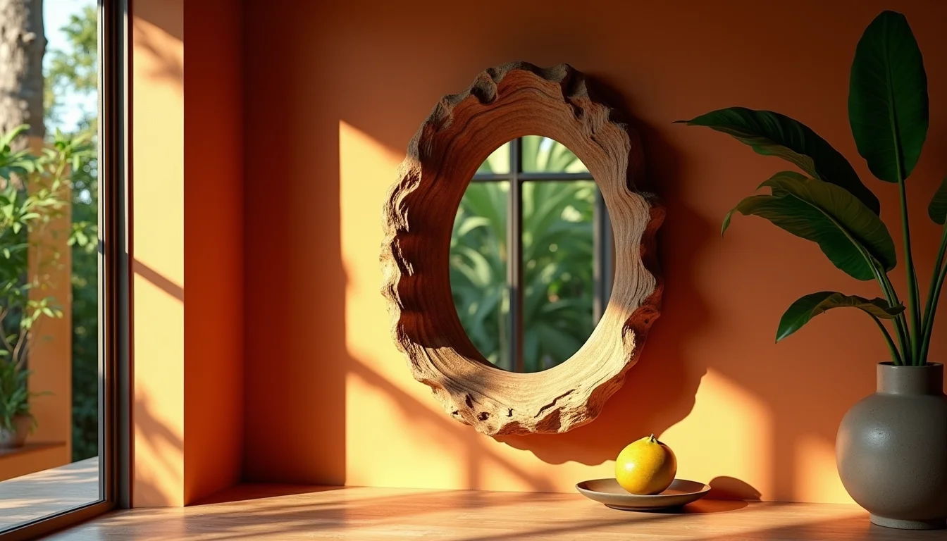 - Moldura artesanal em madeira de demolição ou fibra de coco agrega textura e sustentabilidade. O contraste entre o vidro frio e o material orgânico transforma o espelho em uma escultura funcional.
