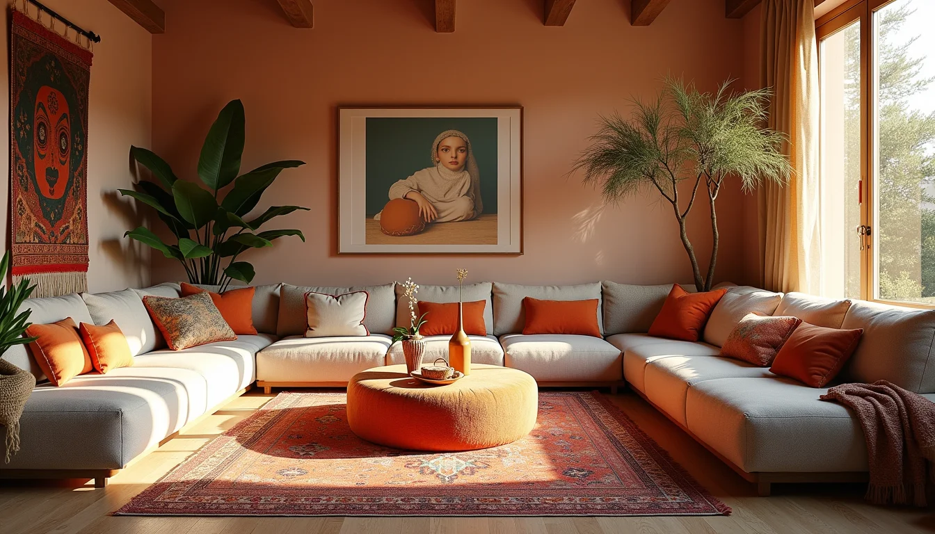 - Superfícies com Tapetes: Tapetes, especialmente os de inspiração oriental ou com franjas, são essenciais. Eles delimitam espaços e adicionam calor e cor ao piso.