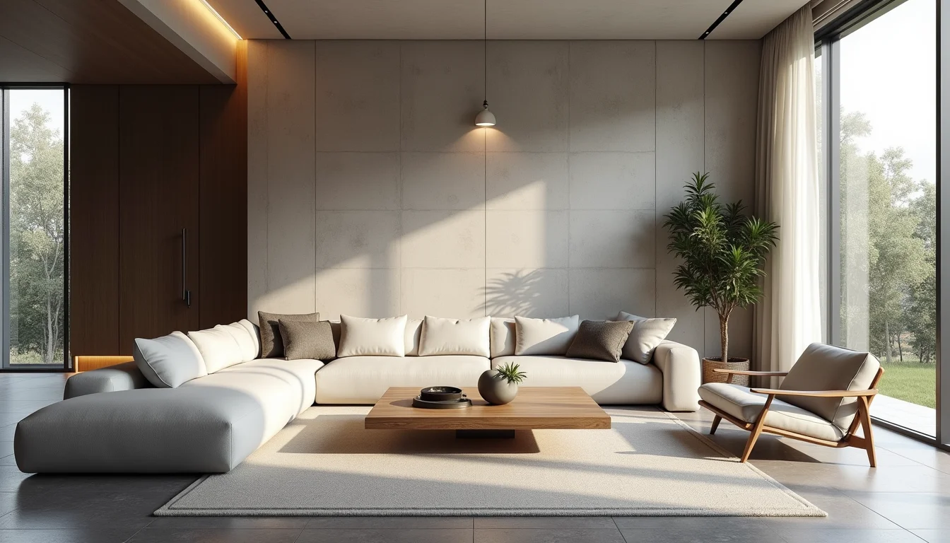 Parede de destaque em microcimento com tonalidade terrosa, textura que imita pedra natural, adicionando aconchego a um ambiente minimalista.