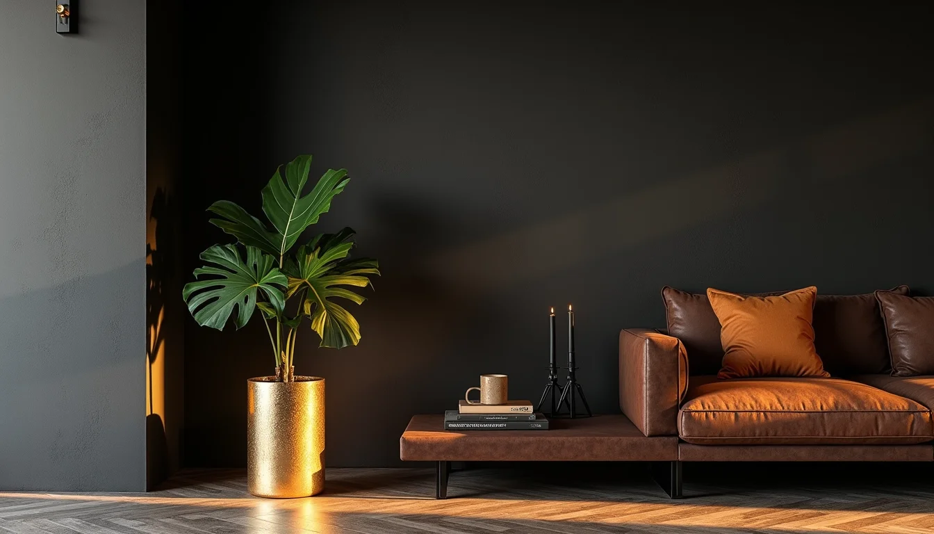 Não é sobre cobrir tudo de ouro, mas sim pontuar o preto com toques metálicos estratégicos. Luminárias, puxadores ou uma moldura fina já fazem toda a diferença.